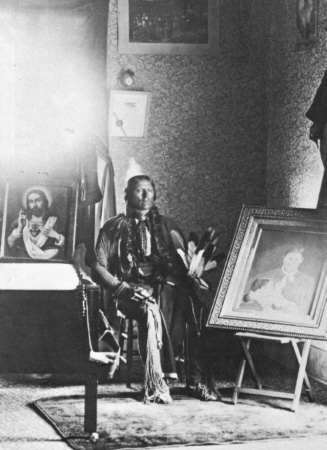 Parker um 1895 in seinem Wohnzimmer; rechts ein Bild seiner