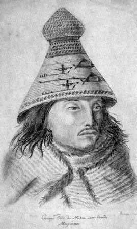 Maquinna, Häuptling der Nootka (geb. um 1758; getötet um 1820) Er verstand die gegensätzlichen Handelsinteressen von Spaniern und Briten lange Zeit zum eigenen Vorteil auszunutzen.